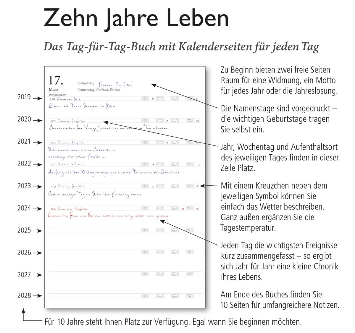 An jedem Tag kann diese Lebensgeschichte beginnen ¿ nicht nur zum Jahresanfang. An jedem einzelnen Tag kann auf der jeweils gleichen Seite über Jahre hinweg ein Moment, ein Ereignis, ein Tagesablauf festgehalten werden ¿ und man wird alle Jahre erinnert, wenn man wieder etwas notiert, was vom Tag in Erinnerung bleiben soll.